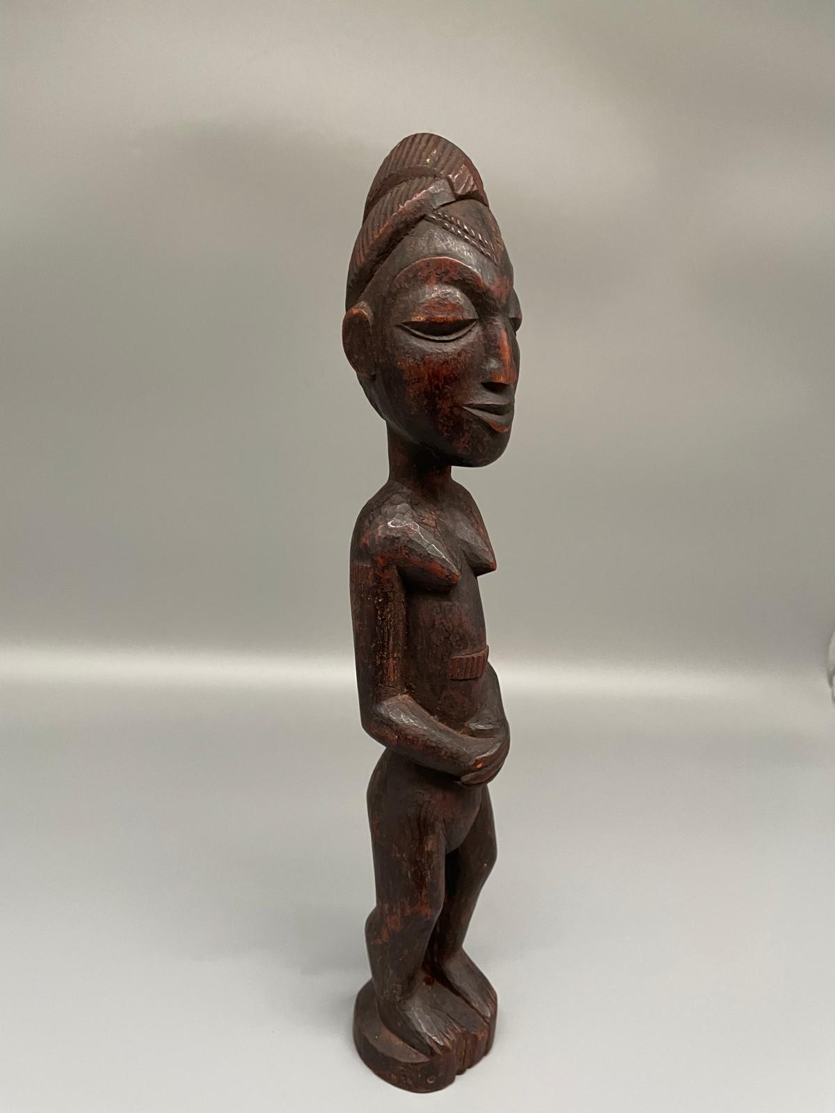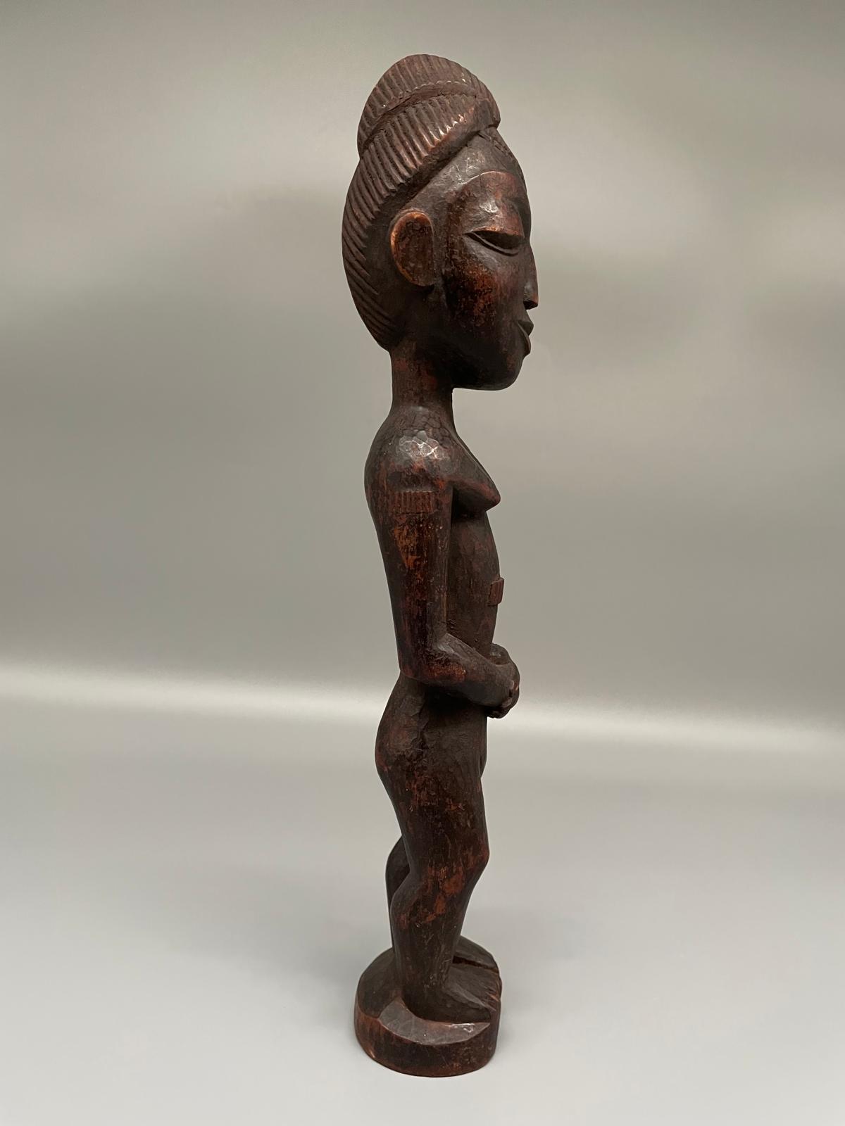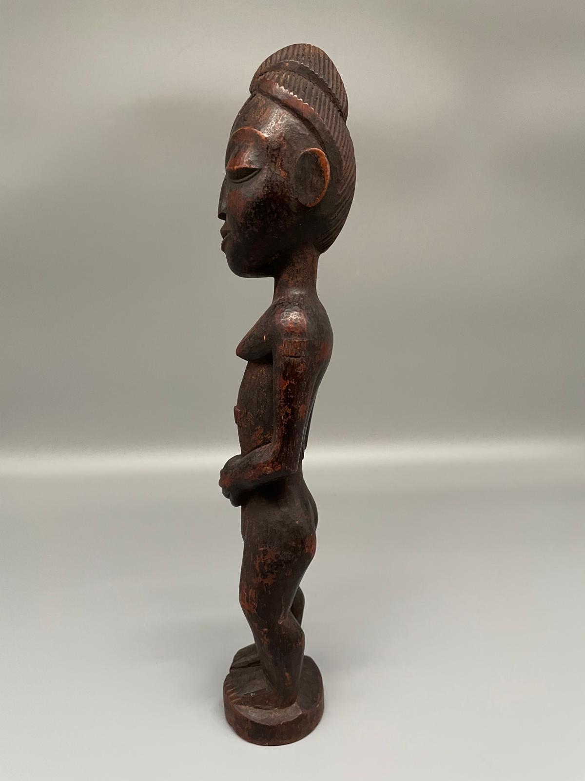 Belle, ancienne statuette féminine Baoulé de Côte d’Ivoire. C’est une sculpture vivante avec de la personnalité et une belle force intérieure. La sculpture semble en mouvement grâce au décalage de ses jambes. Elle est recouverte de scarifications créant des motifs sur tout son corps. Joli travail de la coiffe. La patine est principalement lisse, couleur miel.