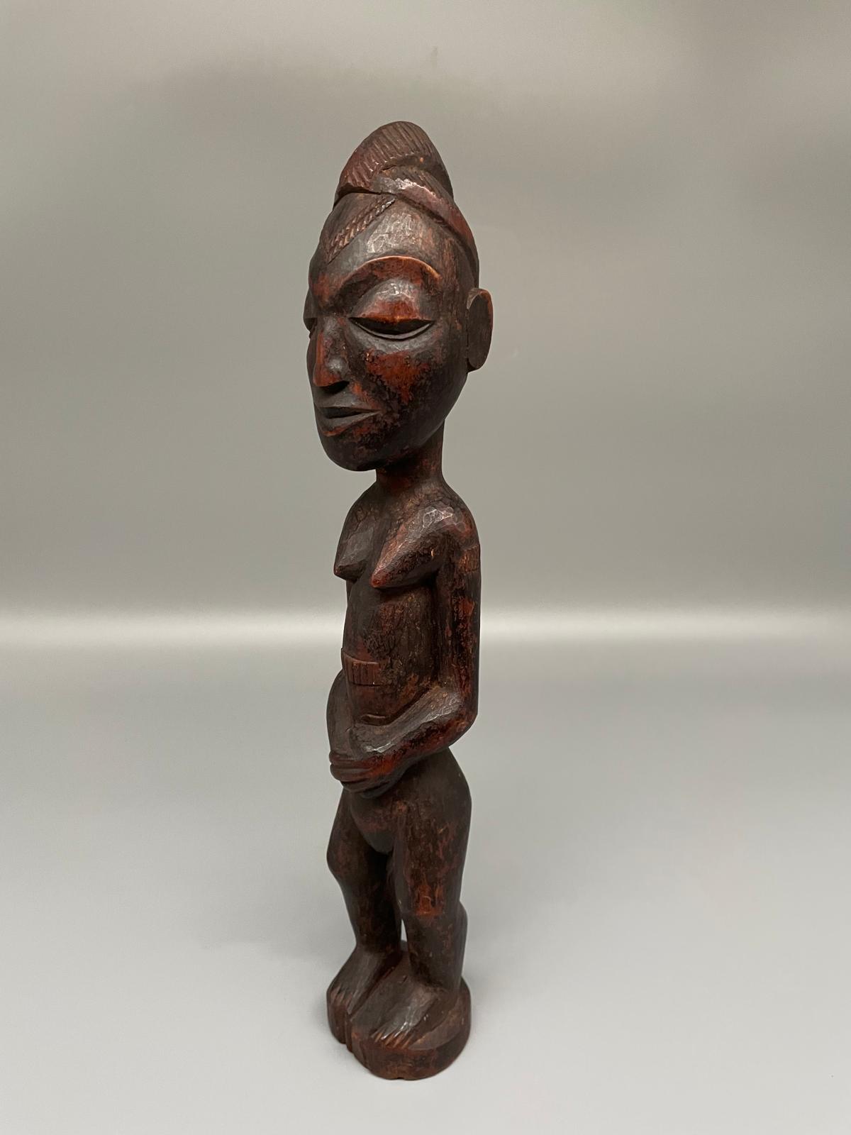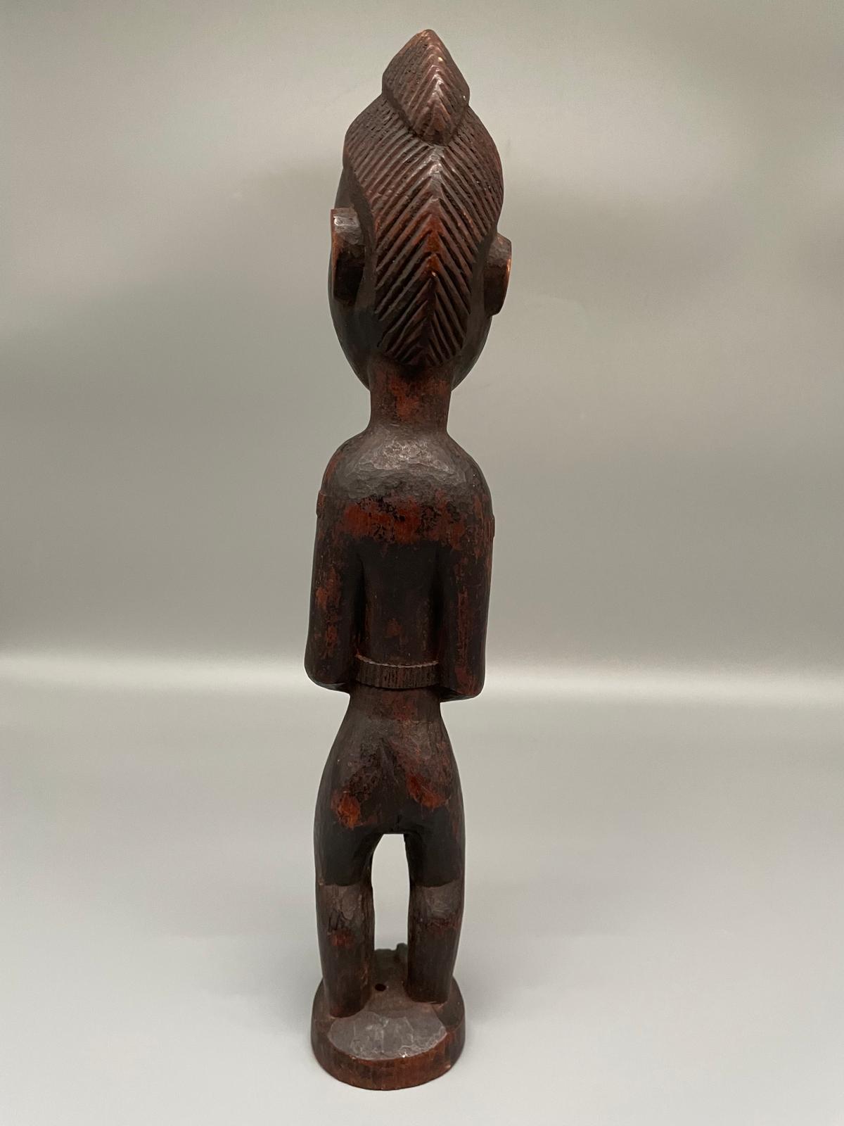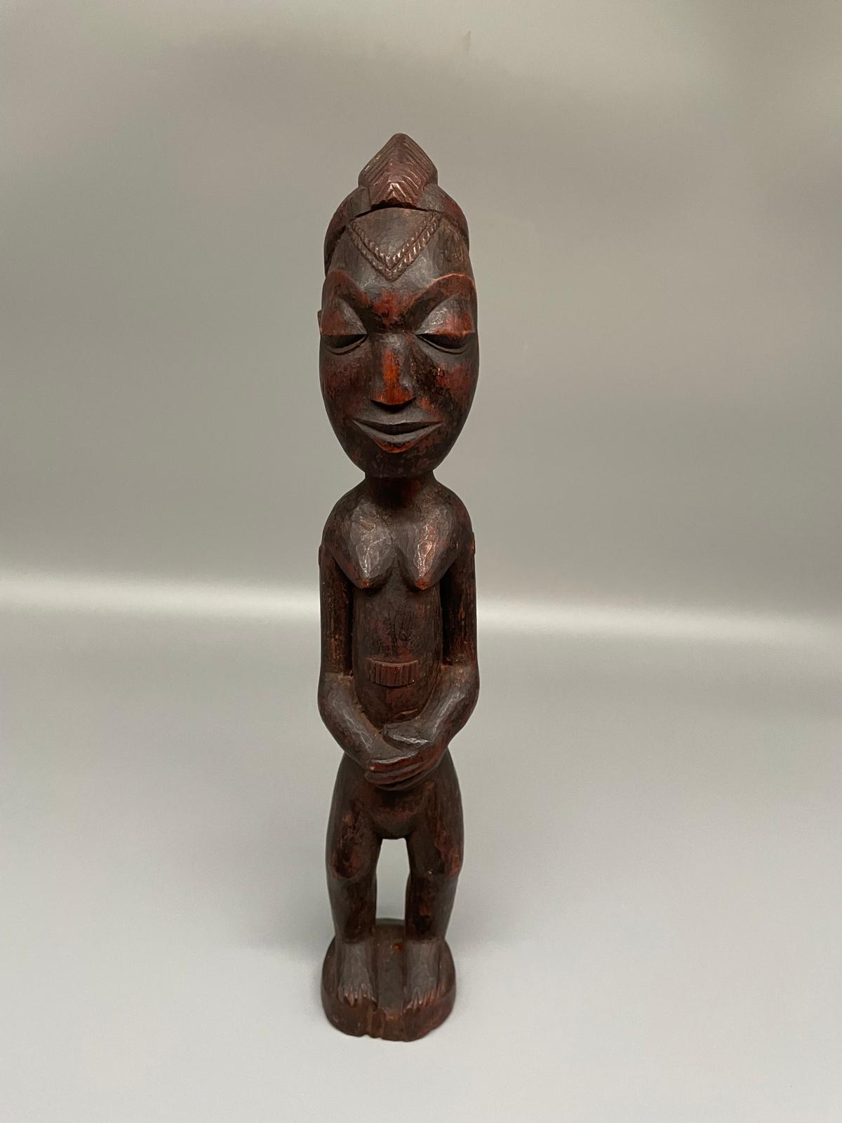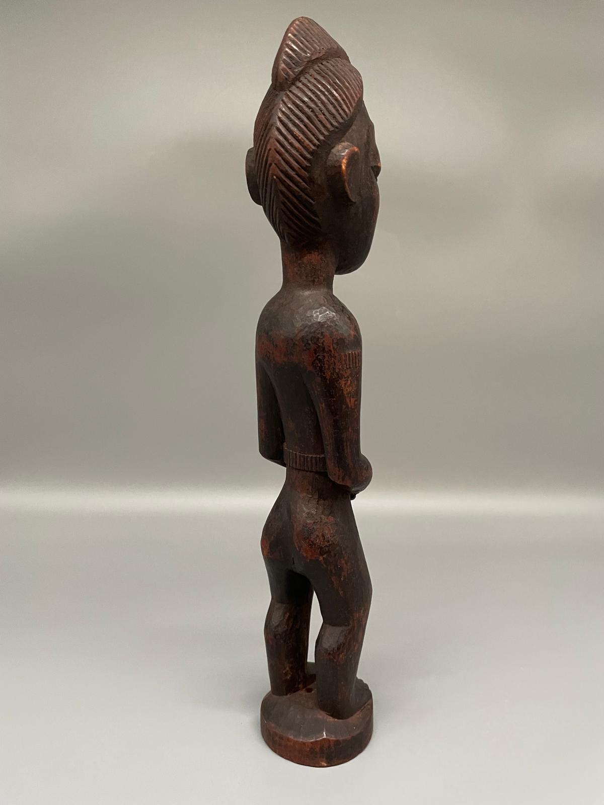 Belle, ancienne statuette féminine Baoulé de Côte d’Ivoire. C’est une sculpture vivante avec de la personnalité et une belle force intérieure. La sculpture semble en mouvement grâce au décalage de ses jambes. Elle est recouverte de scarifications créant des motifs sur tout son corps. Joli travail de la coiffe. La patine est principalement lisse, couleur miel.